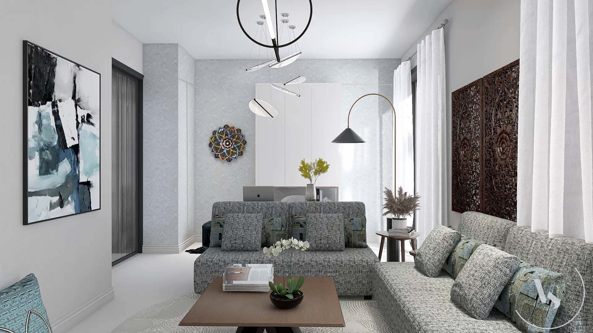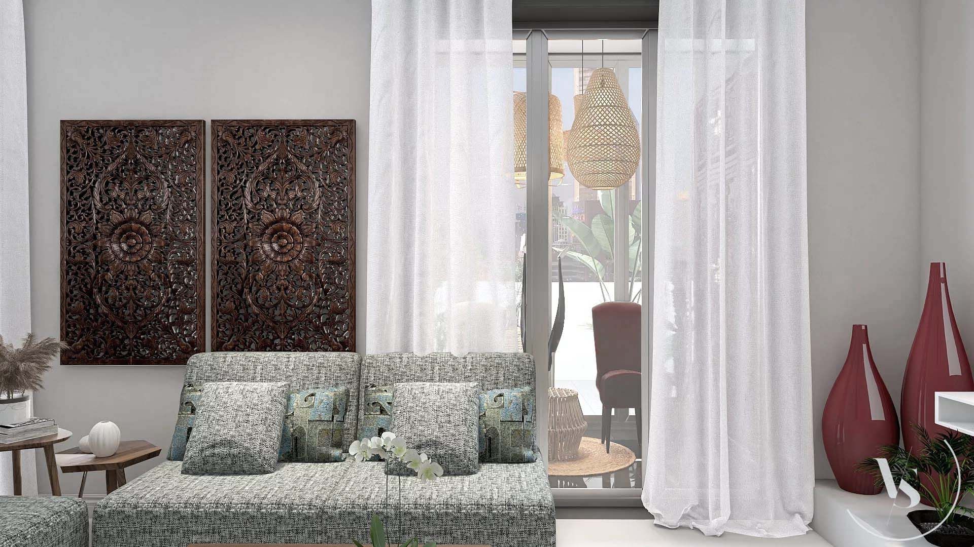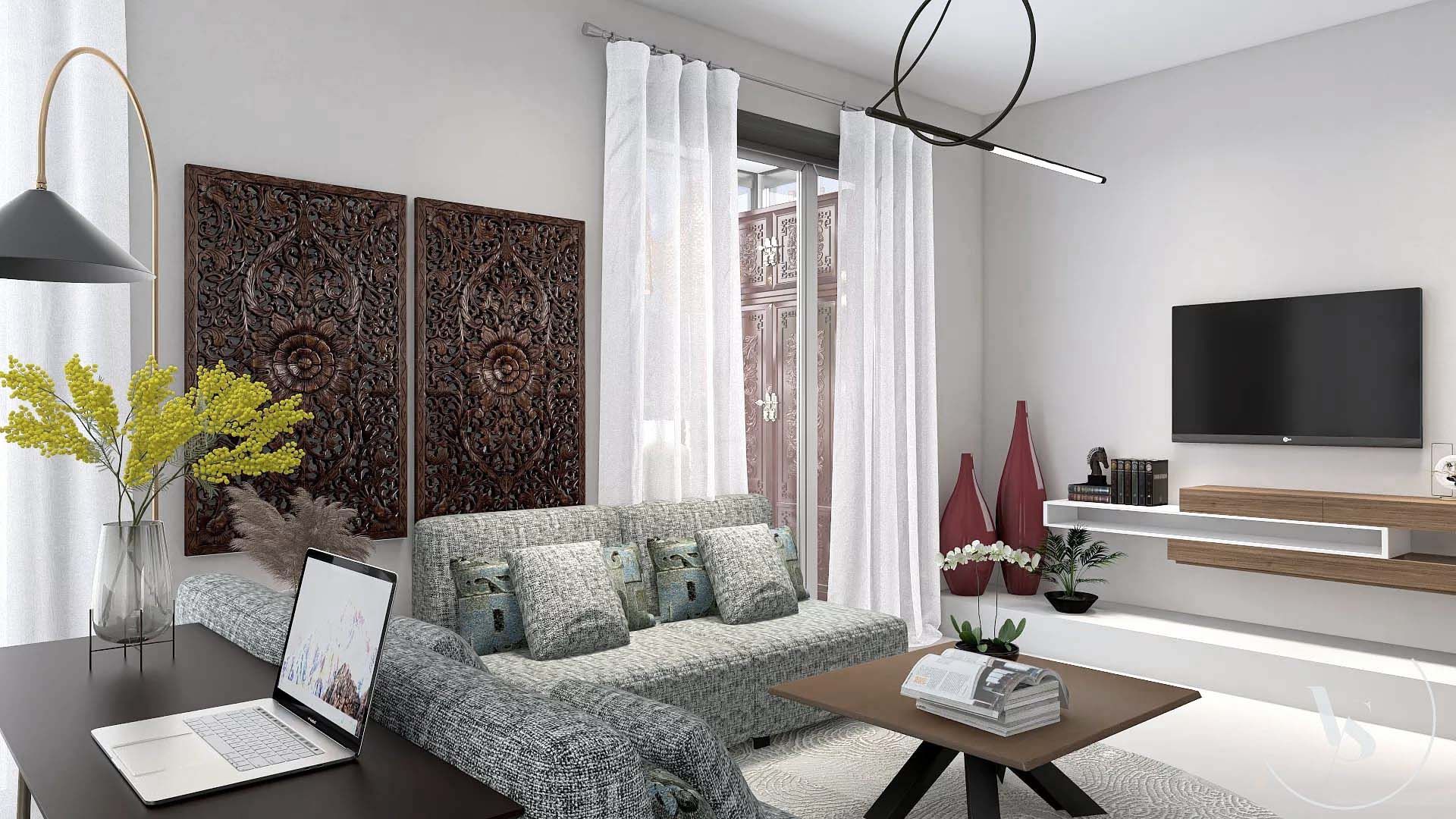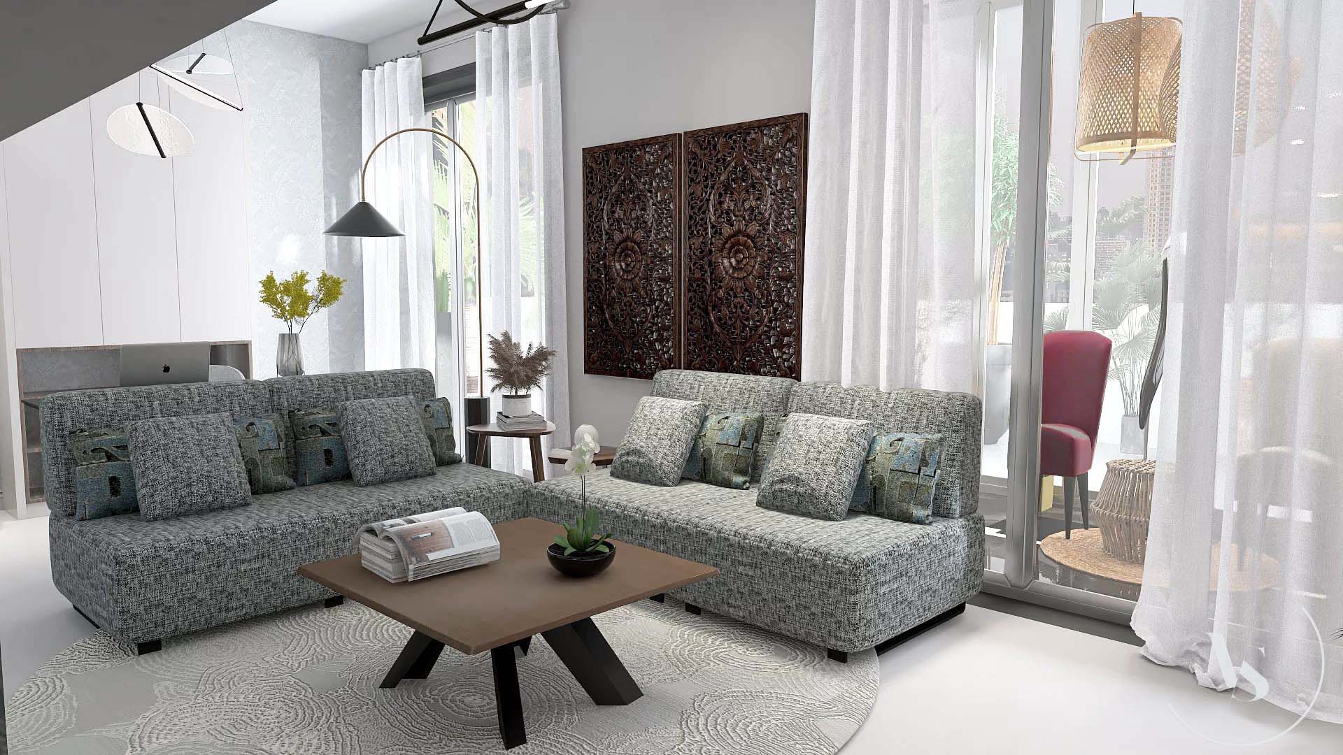 Progetto soggiorno e ingresso in stile marocchino moderno.